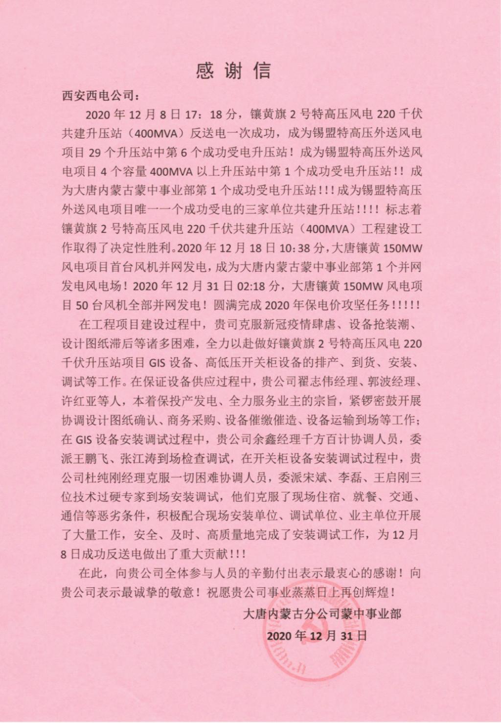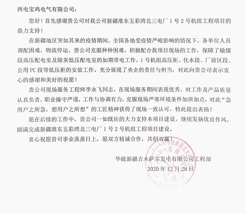 近日,西電寶雞電氣、寶光智能先后收到華能新疆吉木薩爾發(fā)電有限公司、山東電力建設(shè)第三工程有限公司、山東濟(jì)寧圣地電業(yè)集團(tuán)有限公司濟(jì)寧金塔110KV輸變電工程施工項(xiàng)目部、大唐內(nèi)蒙古分公司蒙中事業(yè)部四封感謝信。 四封感謝信都對西電寶雞電氣、寶光智能“急用戶所急、想用戶所想”的工匠精神表示高度認(rèn)可和表揚(yáng);對公司運(yùn)維服務(wù)工作人員熟練的工作技能,認(rèn)真的工作態(tài)度、不怕吃苦的工作精神表示衷心的感謝;全心全意為工程建成投產(chǎn)提供了重要保障,充分彰顯了央企擔(dān)當(dāng),并希望雙方能夠精誠合作,共同創(chuàng)造更多的精品工程。