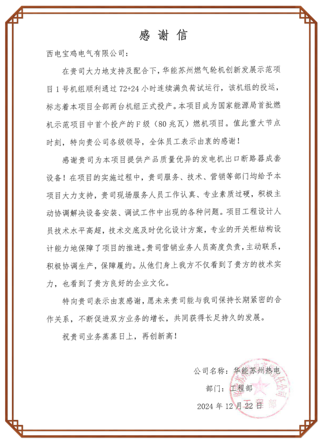 近日,華能蘇州燃氣輪機創(chuàng)新發(fā)展示范項目1號機組順利通過72+24小時連續(xù)滿負荷試運行,標志著該項目全部兩臺機組正式投產(chǎn)。華能蘇州熱電有限責任公司發(fā)來感謝信,向西電寶雞電氣所有關心、支持蘇州燃氣輪機創(chuàng)新發(fā)展示范項目建設的領導和同仁致以由衷的感謝。